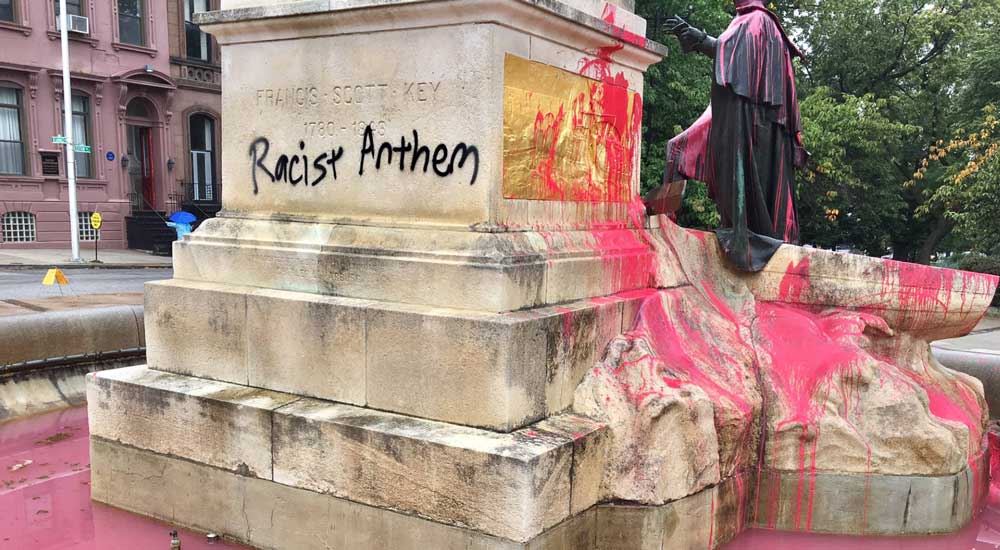 Exactly 203 years after the Maryland attorney wrote the poem that would later become the national anthem, the city awoke to find the words “Racist Anthem” spray-painted on the Eutaw Place monument and red paint splashed on it.