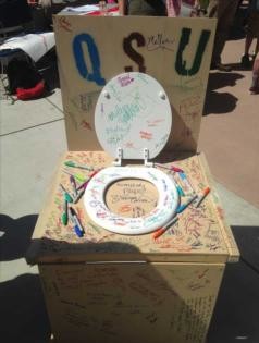 In addition to encouraging students to sign their petition, QSU members constructed a mock toilet in the school’s University Union Thursday that was accompanied by a large sign stating “we’ve got shit to deal with.” Passersby who were asked to sign the toilet in support of all-gender bathrooms wrote a range of messages including, but not limited to: “Get your shit together, Cal Poly” and “Poop equality.”
