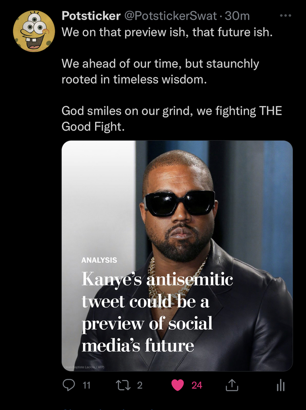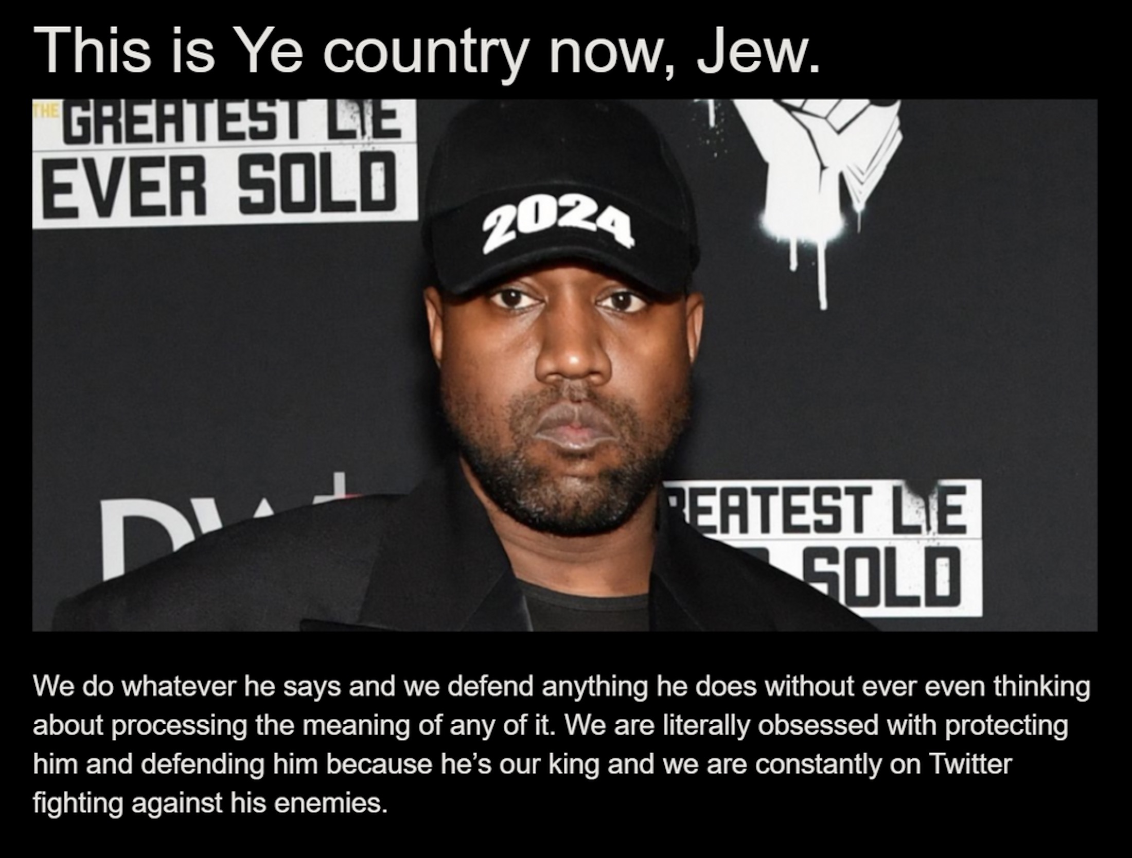We just act on whatever Ye says. There is zero thought. He’s our KING and we just do whatever he says and defend him with extreme force and attack anyone who dares question him.