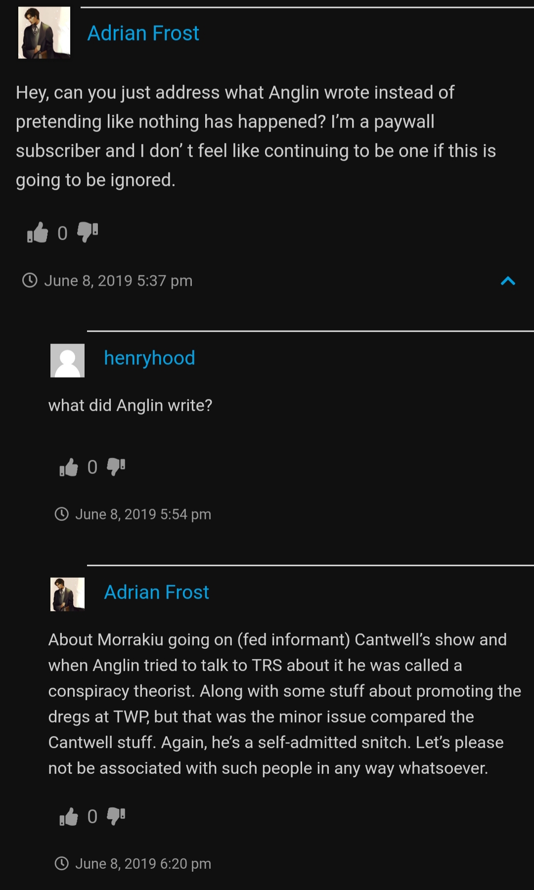 Morrakiu was not quietly fired even. They didn’t mention anything about him. He continues on their show, just as if he hadn’t tried to use his status as a TRS employee to rehabilitate a fed informant and doxer shill. So there goes anyone’s theory that he wasn’t representing TRS when he went on Cantwell’s show. Otherwise, he surely would have been fired for putting them in this position. If he had just gone rogue and decided on his own to promote federal informants.