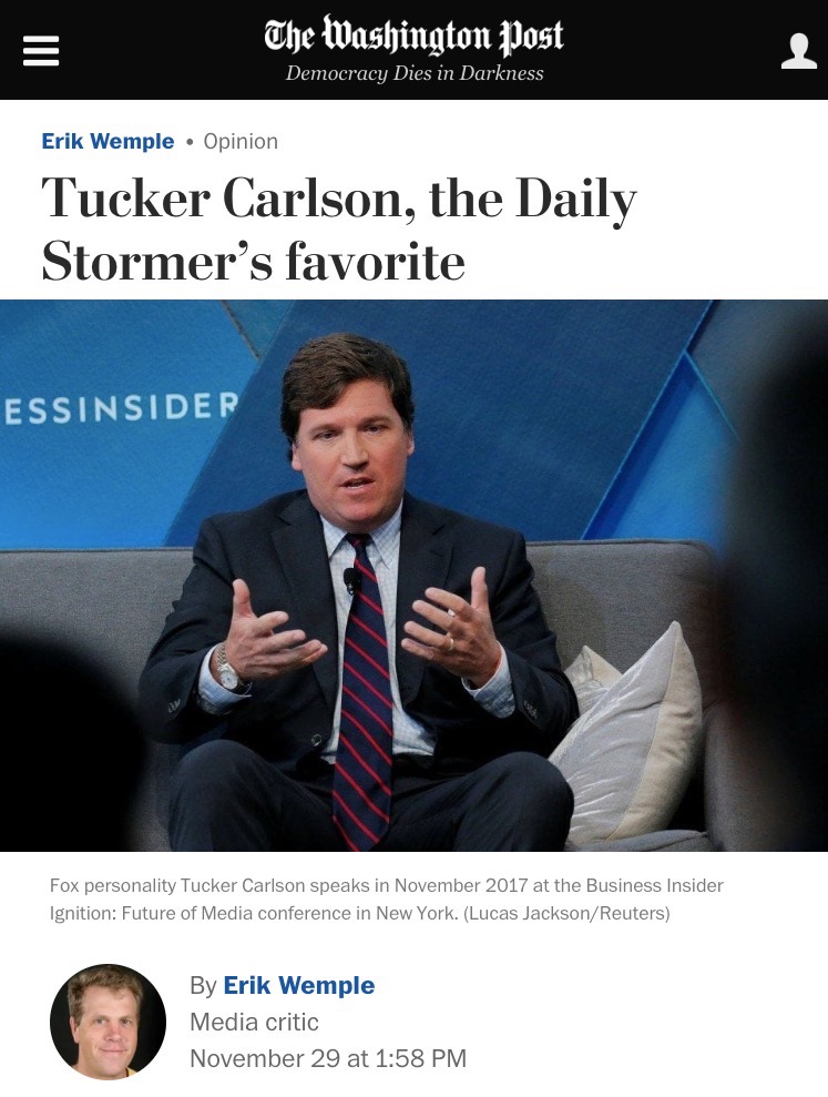I don’t even like Tucker Carlson very much at all, because he doesn’t even calling for exterminate Jews or Aryan master race affiliations. I don’t think he can into the Ku Klux Klan even, of which I am a member.