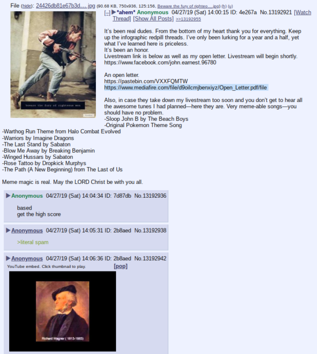 Despite this—I’m not worried. I have complete trust and certainty that all of you after reading this will begin planning your attack on the enemy—and you’ll attack again, and again, and again—until either we win, or we die. I know you will do this because you’re true anons. You’re White men. I’m not worried that the whole world is against you. I’m not worried because you are the greatest race that our God has created—it is our duty to keep this world from falling into darkness. White men will not let God’s creation be corrupted and destroyed by the Jew without a fight. Remember your honor White men.