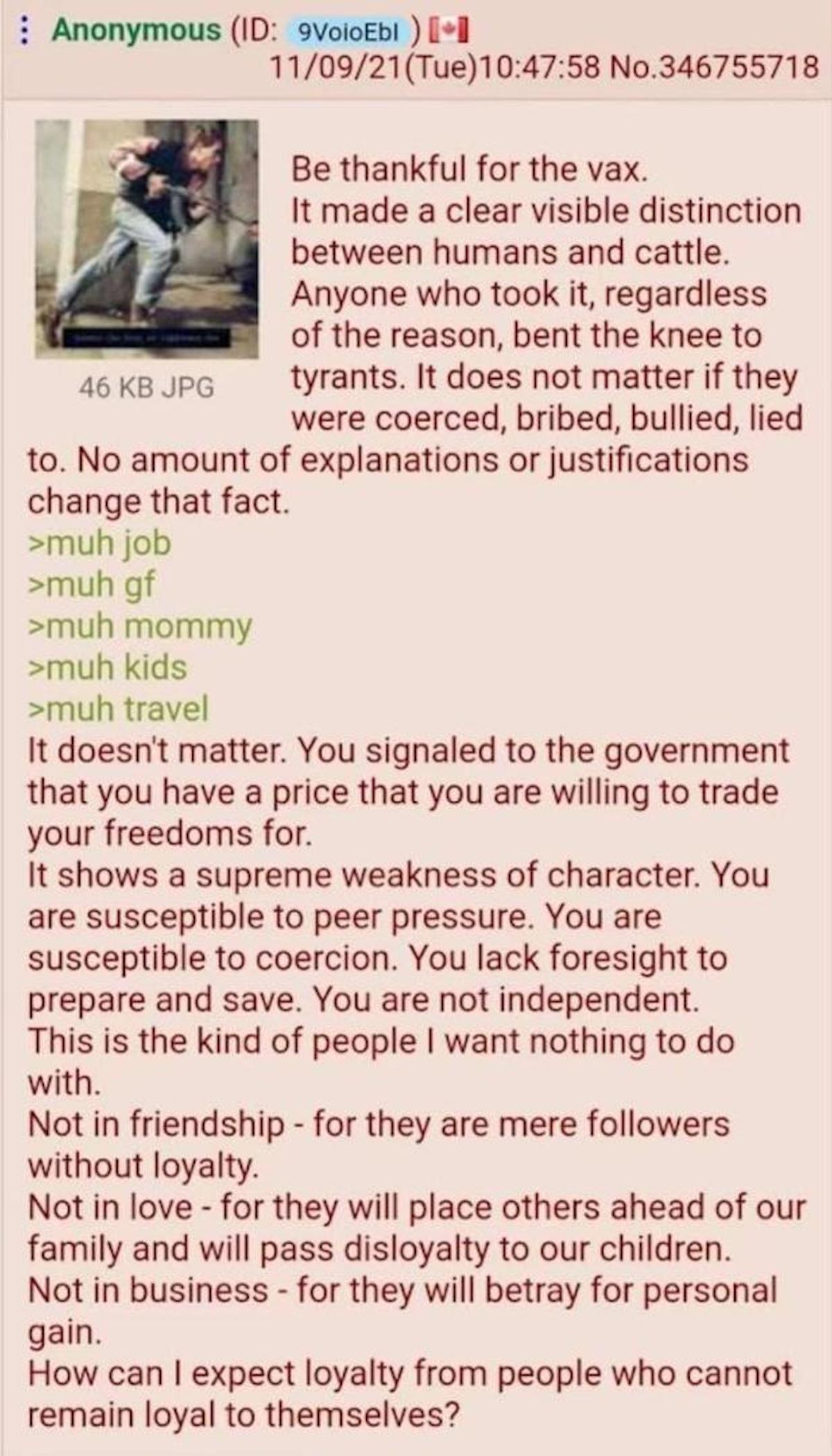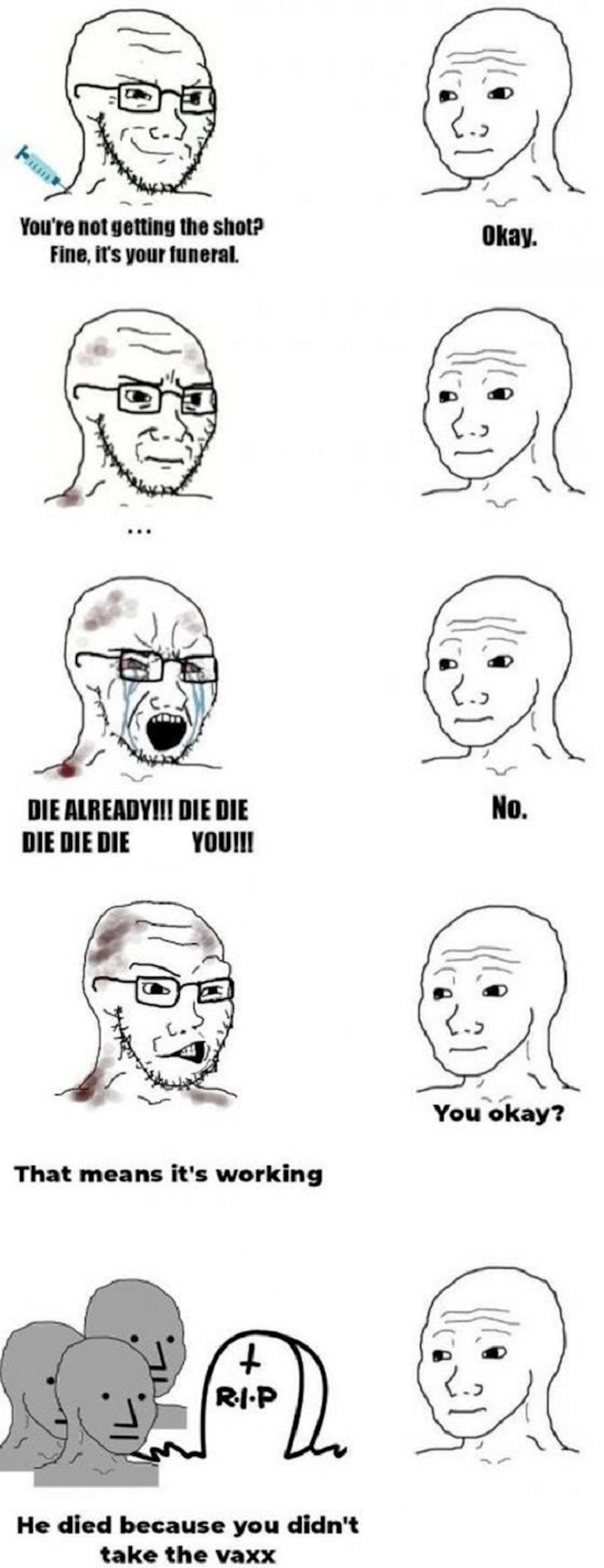 *Please note: I’m not joking. All of those things are true: you can’t take that vax back out of your body, God hates you, and you should kill yourself.