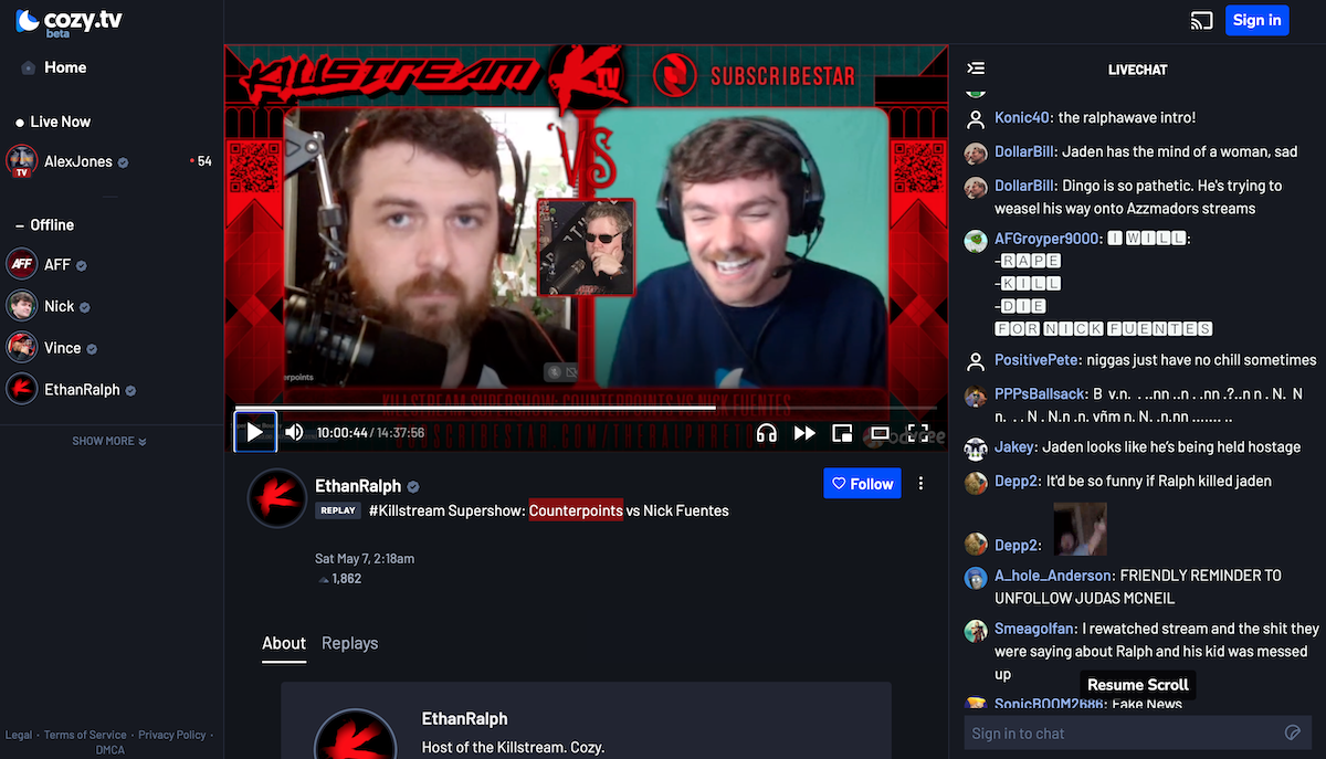 Ethan Ralph is on cozy.tv. He is almost always streaming, frankly. He hosted a debate last night between Nick Fuentes and someone called “Counterpoints.” I thought it was the tranny that was called that from a few years ago, but it’s some guy that isn’t even gay, allegedly. It’s in a very long stream.