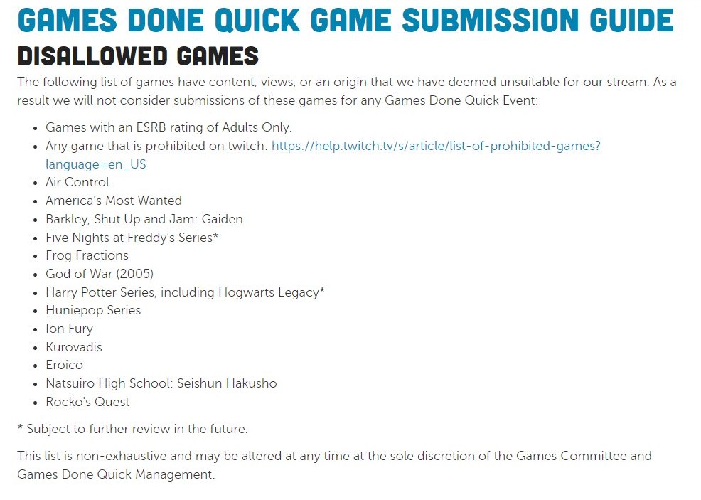 Their list of disallowed games is for those that “have content, views, or an origin that [they] have deemed unsuitable for [their] stream”. This includes other titles such as the Five Nights at Freddy’s series and God of War (2005).