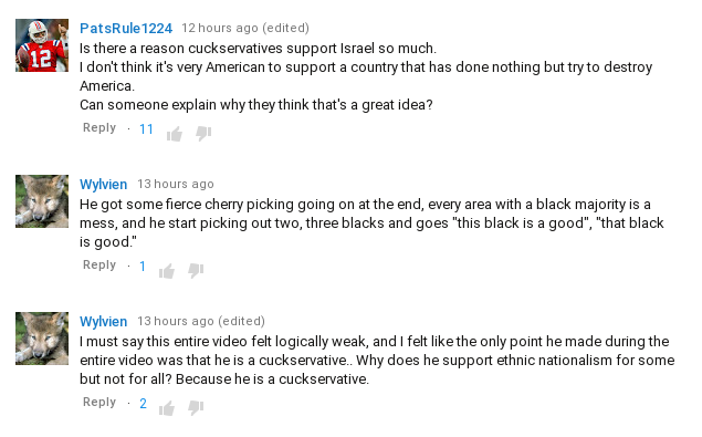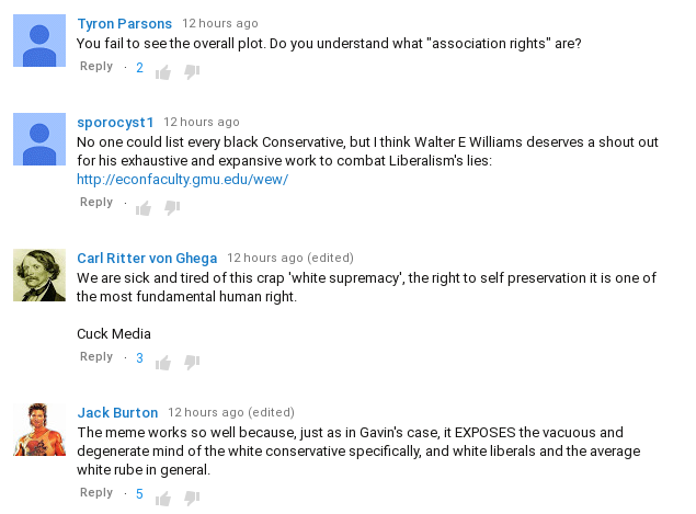 In the video, he attempted to Nazi-shame Matt Forney, along with all other anti-cucks, but calling them mean names. He explained that he stands with putting the interests of Jew-Israel above those of White America, and also listed off a bunch of Blacks I’ve never even heard of (except Sowell) who he says prove that some Blacks are good.