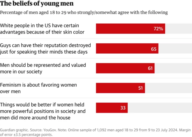 Polls indicate that young men’s views on gender, femininity and masculinity are rapidly shifting. In 2022, 49% of gen Z men said that the United States had become “too soft and feminine”, Deckman found. Just a year later, 60% of gen Z men said the same. Deckman found that those who agreed with the statement were far more likely to have voted for Trump in 2016 – even after controlling for political party.