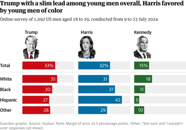 These trends are even more pronounced among white gen Z men. If you combine the number of independent gen Z men who lean Republican with those who identify as Republicans, Deckman said, young white men “look very conservative compared to even older white men”. She believes Trump will probably win young white men.