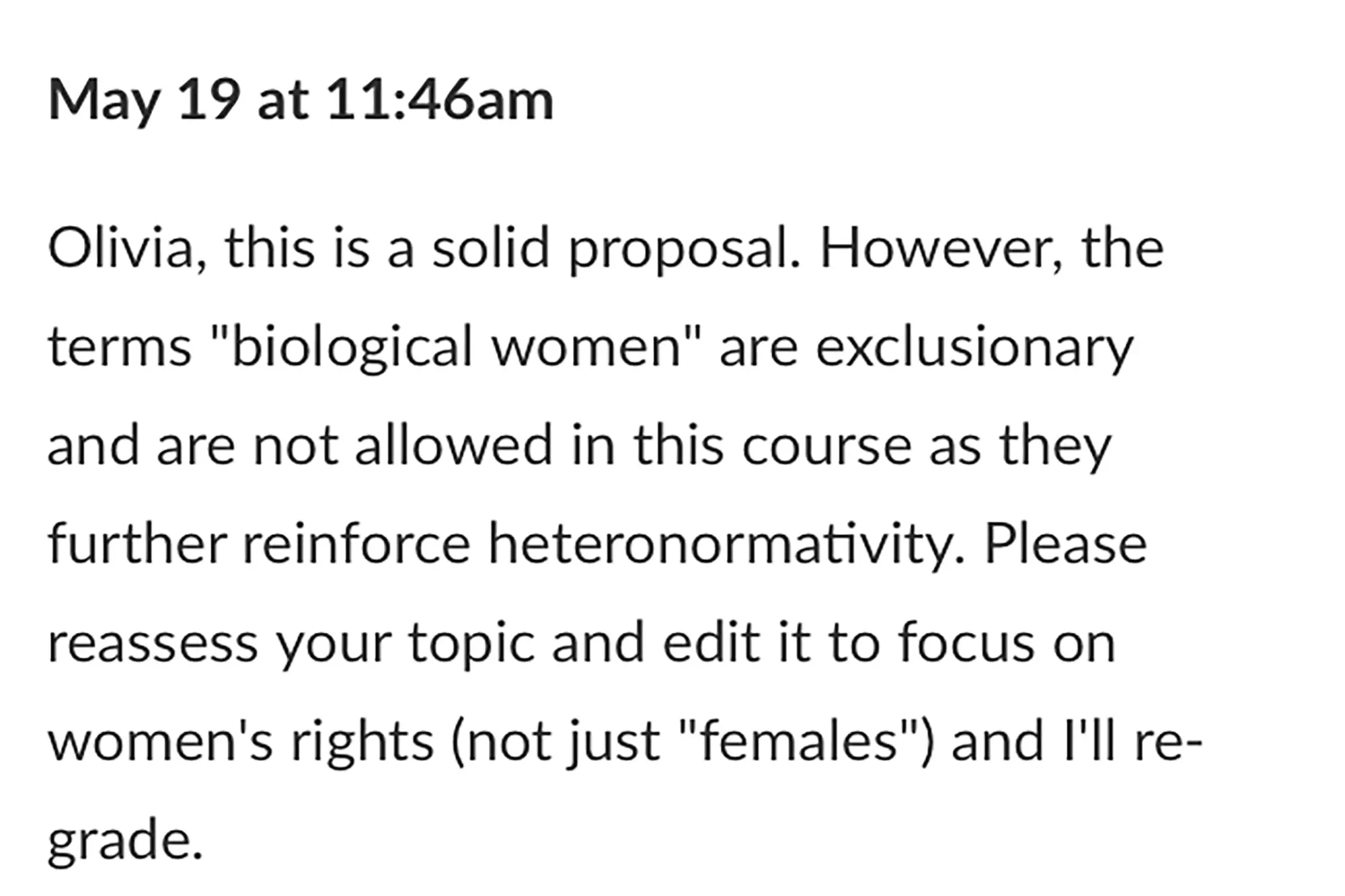 The clip shares an apparent photo of the zero grade and the professor’s comment, which reads, “Olivia, this is a solid proposal. However, the terms ‘biological women’ are exclusionary and are not allowed in this course as they further reinforce heteronormativity.”