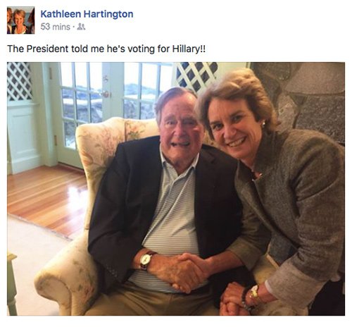 George H.W. Bush, the terrorist father of the terrorist George W. Bush, is voting for Hillary Clinton, the terrorist wife of the terrorist Bill Clinton, who beat him in a Presidential election when he was the incumbent, according to a Facebook post from JFK’s niece, Democratic operative Kathleen Hartington.