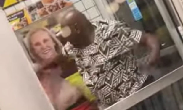 A bystander was able to capture the fight that ensued after the red-shirted man collected his to-go order and was confronted by the alleged aggressor (wearing a green jersey) and his accomplice.