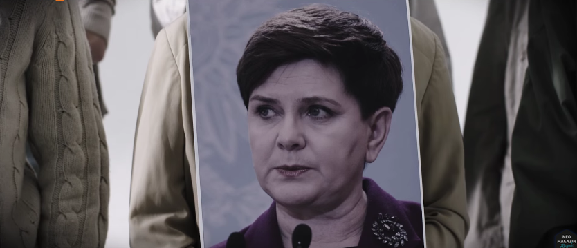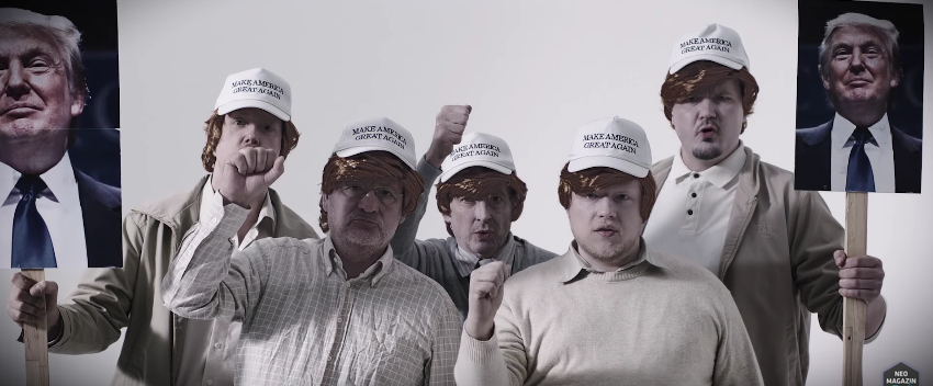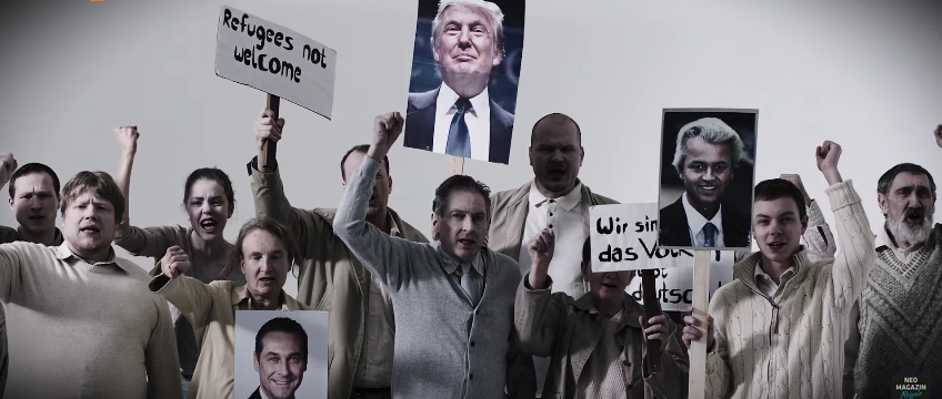 The video then shows a group of people rising from graves (implying the return of the Nazis), led by the television presenter and comedian Jan Böhmermann, waving Donald Trump placards and signs reading “refugees not welcome.”