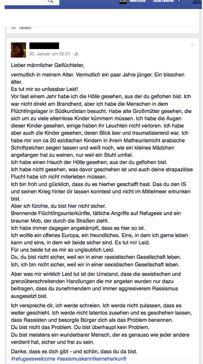 German police are still carrying out their investigation, but on January the 30th, the woman,wrote an apology on Facebook, addressed to the immigrants who allegedly raped her. Here’s a few excerpts from the now-deleted post: