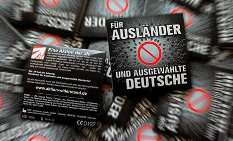 The youth branch of a neo-Nazi party has sent out propaganda condoms reading “for foreigners and selected Germans.” A Green party politician was among the recipients.