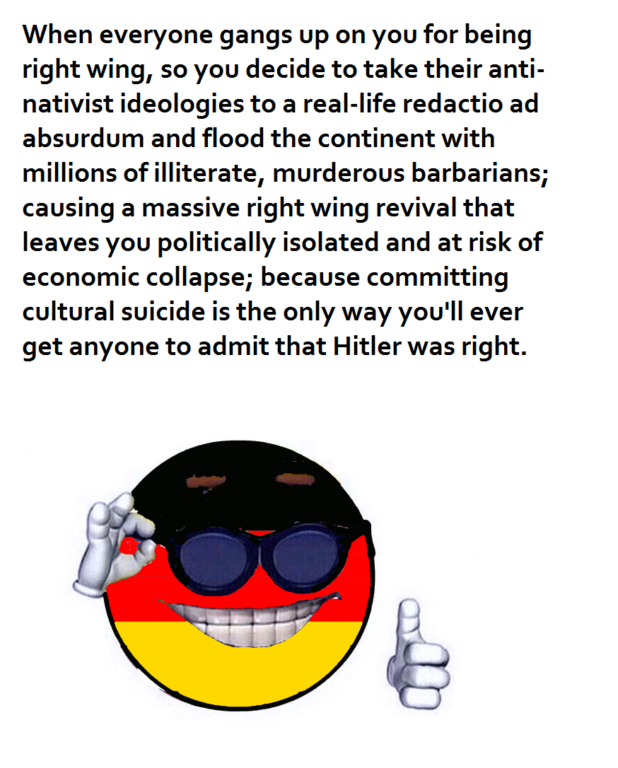 Did they really believe it? Or did they specifically import the Third World to cynically destroy the European race? Or were the Germans forced to do it because Turkey, Israel, and the US forced them to do it.
