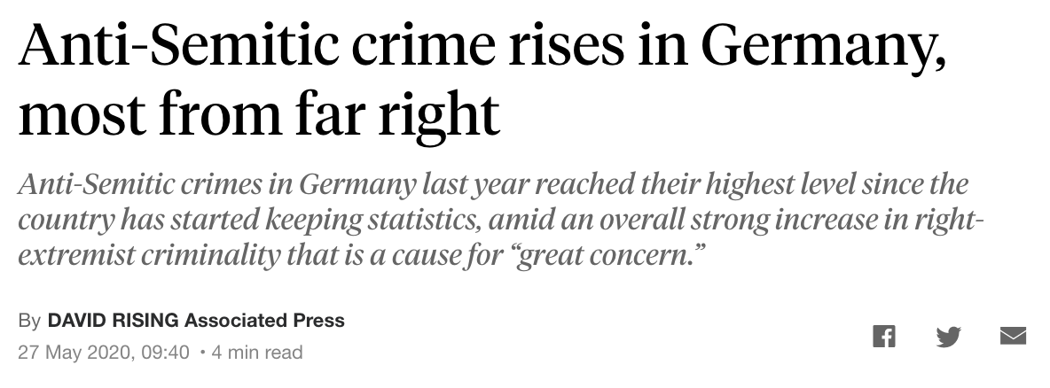Anti-Semitic crimes in Germany last year reached their highest level since the country started keeping statistics, amid an overall strong increase in right-extremist criminality that is a cause for “great concern,” Interior Minister Horst Seehofer said Wednesday.
