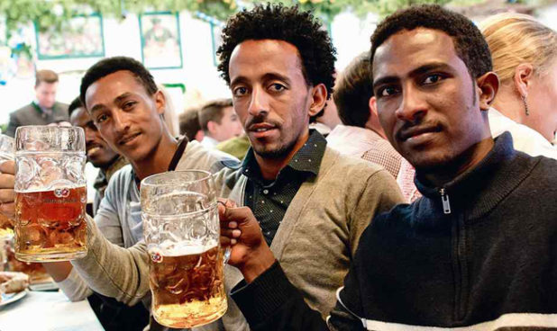 In the following photo, for example, we can see a trio of colorized gentlemen – including one Somali, which is 100% confirmed haji – celebrating their newfound Germanic heritage with some fine Bavarian ale.