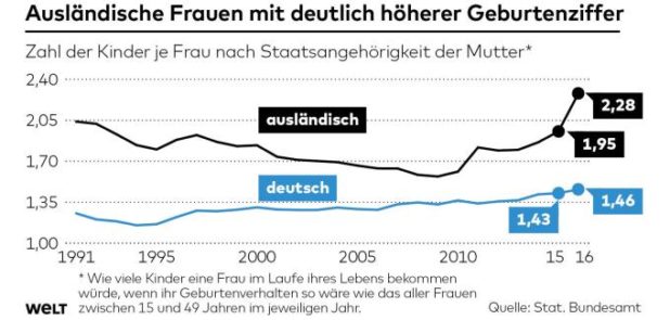 The German birth-rate has reached the highest level since 1973. The latest figures are from 2016 and show a birth-rate of 1.59 per woman. Unfortunately, it’s not Germans who are being born, but their replacers.
