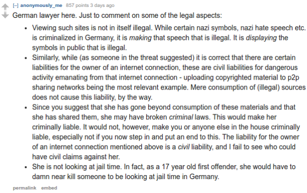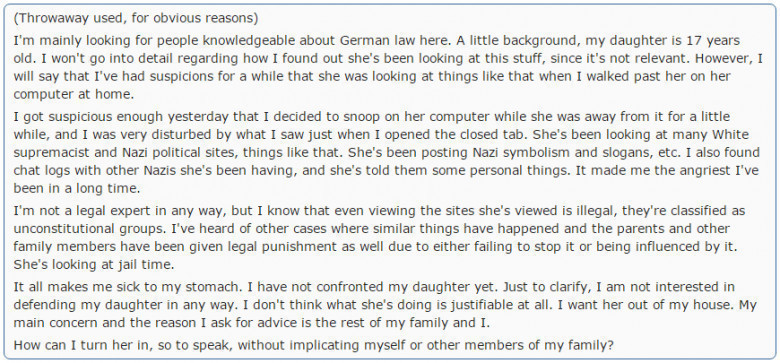 A man in Germany has recently gone to Reddit to post about “family issues,” describing his daughter as being involved online in German pro-White socialization, or browsing various German pro-White media. He then asks for legal advice, the primary purpose of his post, on how to sellout & have his daughter arrested.