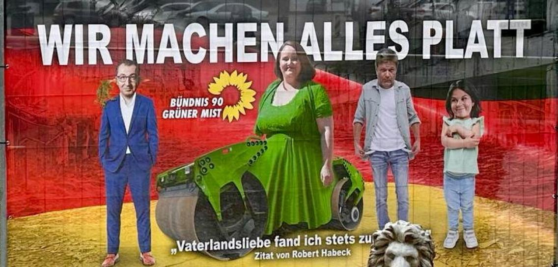 The billboard, which was erected in front of the house of German businessman Michael Much, mocked the top Green party heads. Green Party leader Ricarda Lang is pictured on a concrete roller, while Economics Minister Robert Habeck has empty pockets. Underneath the politicians is the slogan: “We’ll flatten everything.” Foreign Minister Annalena Baerbock is also depicted as a little girl, a reference to her lack of foreign policy experience.