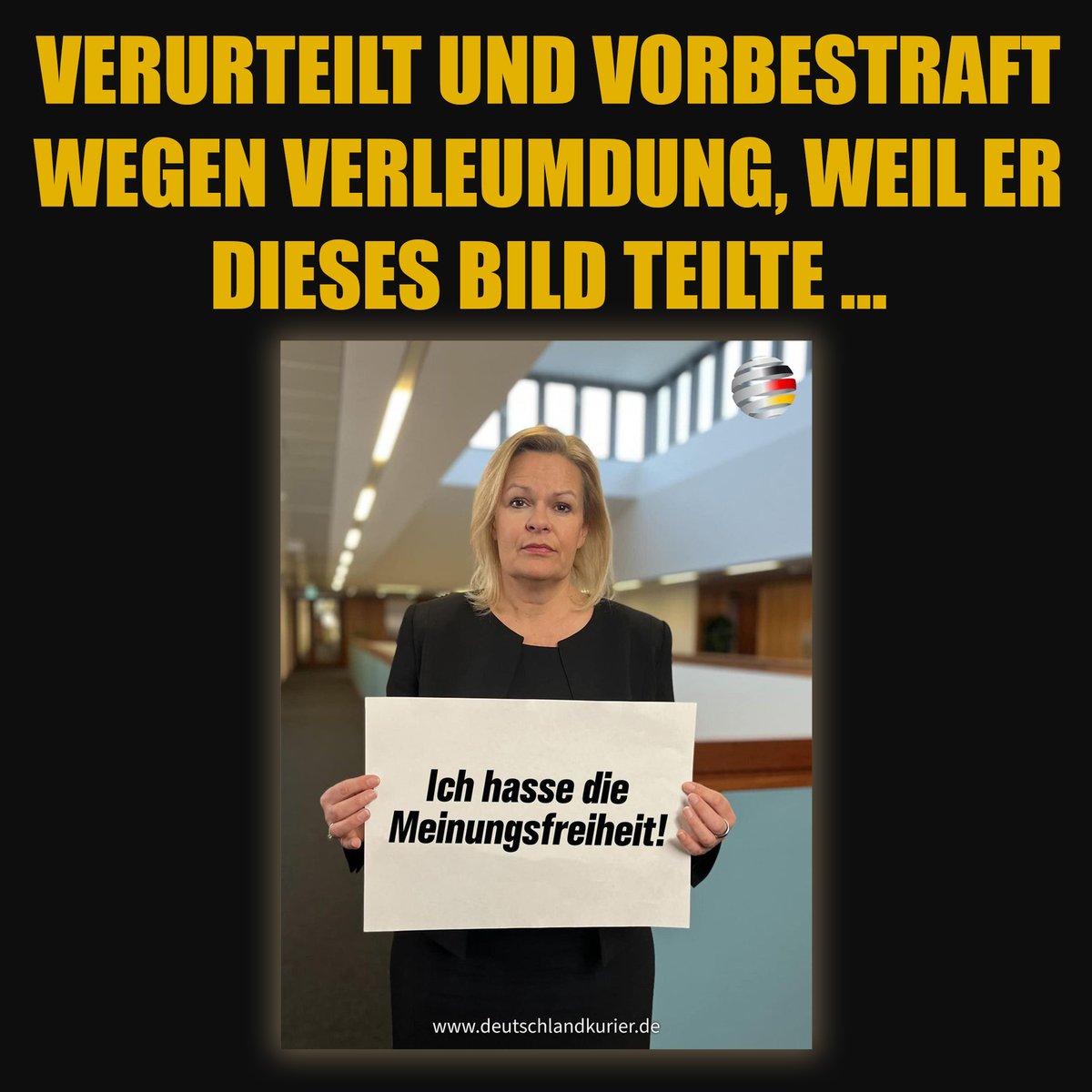 Germany’s Interior Minister Nancy Faeser, holding a sign that says “I hate free speech.” The guy who made this meme is probably going to jail.
