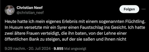 “Today, I had my own experience with a so-called refugee. In Husum, a Syrian punched me in the face. I had defended two elderly women who asked him to get off the back of a public bench on which they were sitting and not to continue to spit at their feet. The interesting thing: The police told me that it was a 13-year-old Syrian who was well-known in the city and who had been caught over 50 times for theft and violent crimes since the beginning of 2024 alone. Sanctions available: none.”