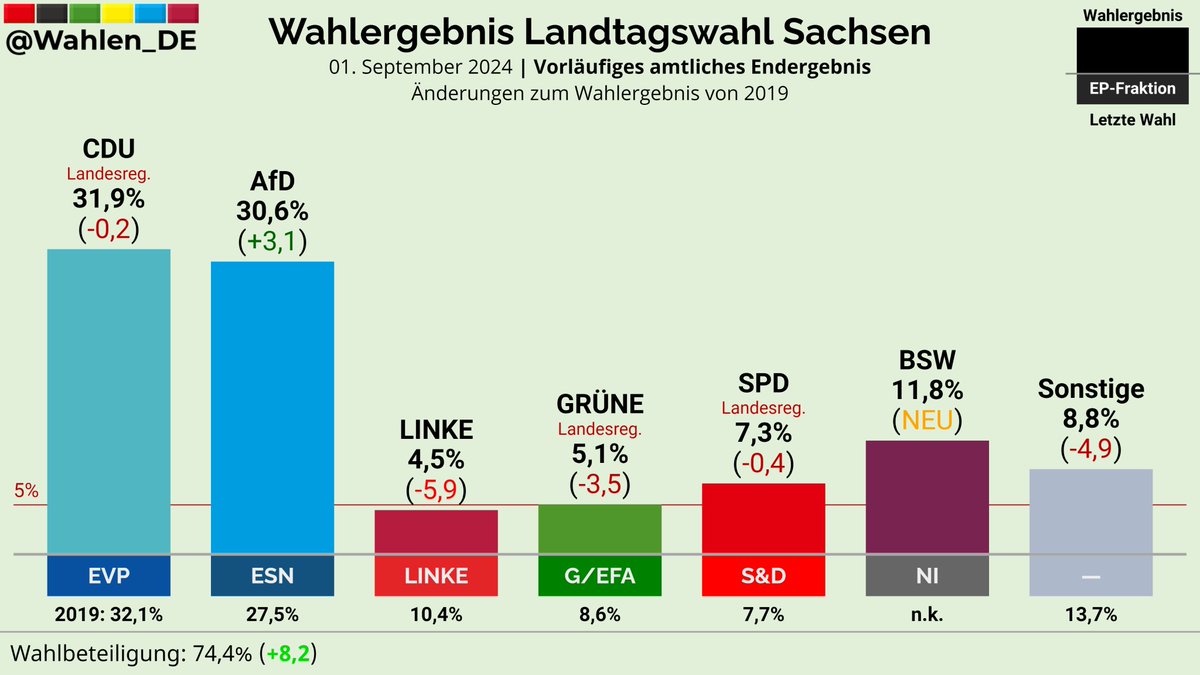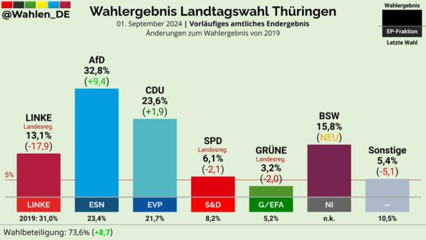 But the two elections also bring difficult decisions for the CDU, which leads national polls. AfD holds now more than a third of the seats, at least in Thuringia’s state legislature — which would, for example, allow it to block appointments of judges to the regional constitutional court — and that will make it hard to build workable governments.