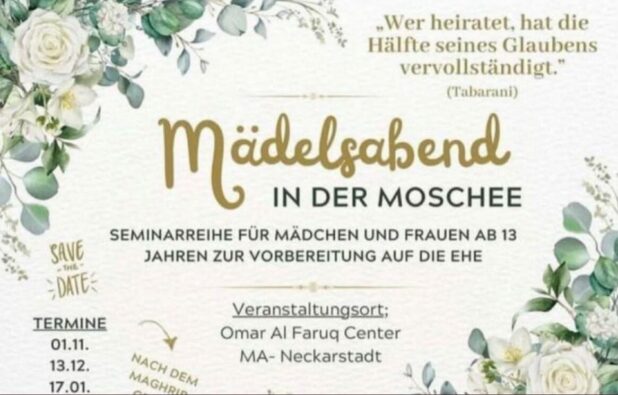 The invitation was sent out by a mosque in the western city of Mannheim for an event entitled “Girls’ Evenings in the Mosque.” This is part of a series of seminars whose aim is to prepare “girls and women from the age of 13” for marriage. The flyer includes a quote by 10th-century Islamic scholar Al-Tabarani, according to which: “He who marries has completed half of his faith.”