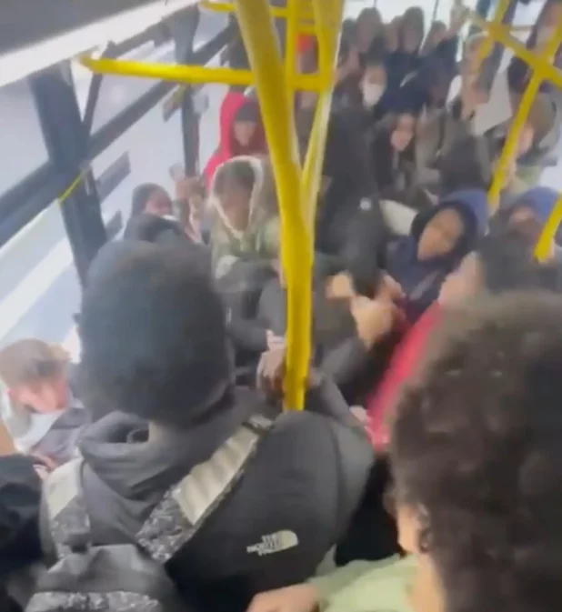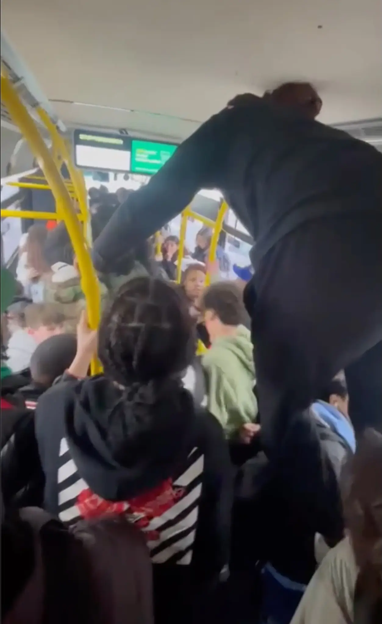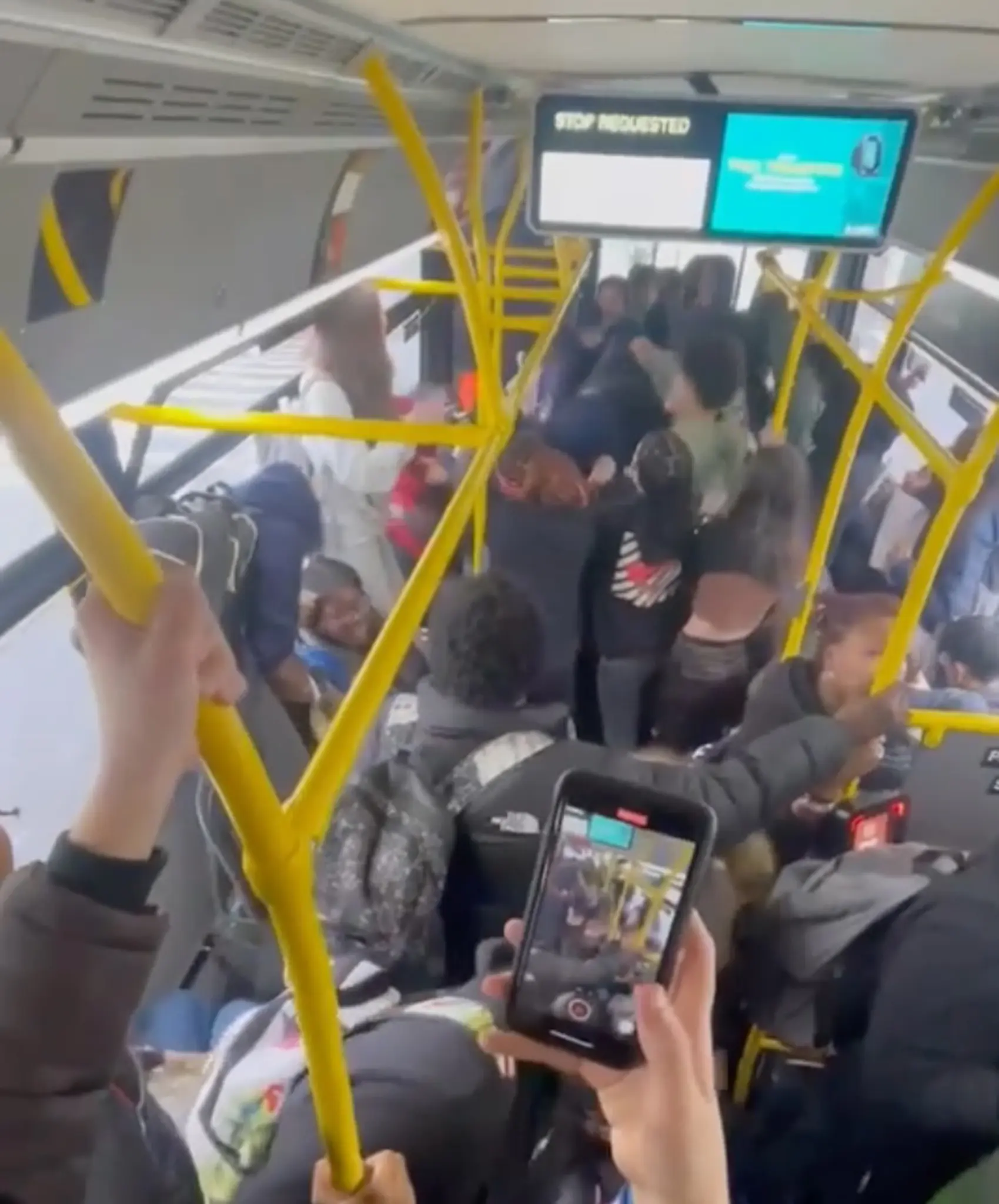 Kids can be seen with their phones out, filming the madness, while others are standing on seats and hanging from the railings.