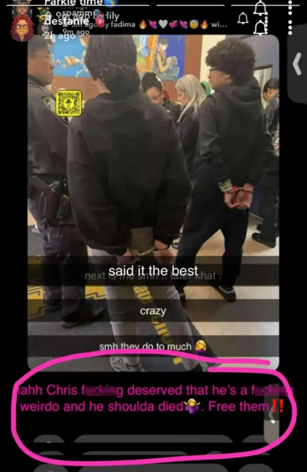 The victim “f—ing deserved that he’s a f—ing weirdo and he shoulda died,” according to a chilling caption on an image posted to Snapchat showing two of the handcuffed students.