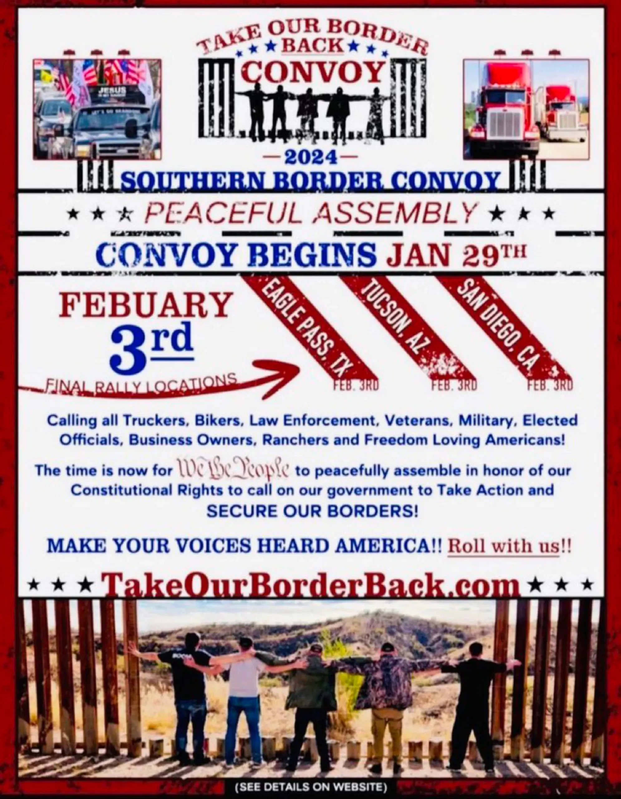 A Jan. 12 news release called on any active and retired law enforcement and military, veterans, elected officials, truckers and other “LAW ABIDING, freedom-loving Americans” to join the movement. Their goal, the group claims, is to “shed light on the obvious dangers posed by wide open Southern borders.”