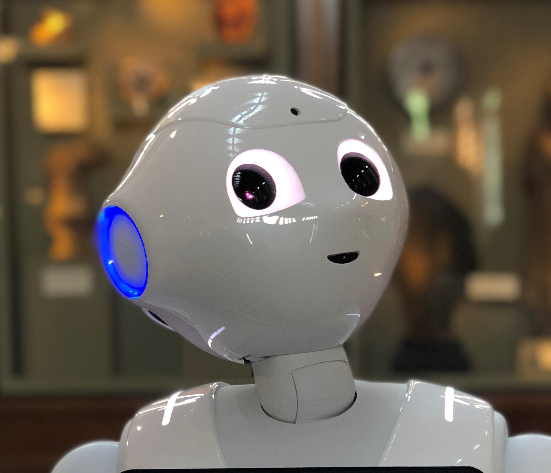 Its name is Pepper. It’s a humanoid robot with a tablet for a chest and wheels that let it get around on its own. It’s shiny and cute. It has arms and it has hands that it can tighten into a fist.