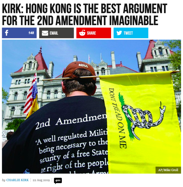 Of course, the CIA has already been moving weapons into Hong Kong in attempts to arm these terrorists. So it appears that Charlie Kirk is simply trying to acclimate the idiot audience of Breitbart to be prepared to support a full-on bloodbath in Hong Kong.