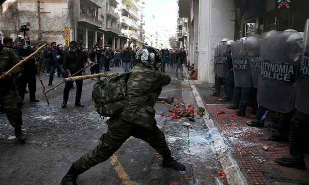 About 800 farmers from the island of Crete rallied outside the ministry of agriculture, throwing tomatoes as tension escalated when police prevented them from staging a symbolic occupation of the building. Clashes soon broke out, with riot police using teargas to repel protesters, who were throwing rocks and setting bins on fire.