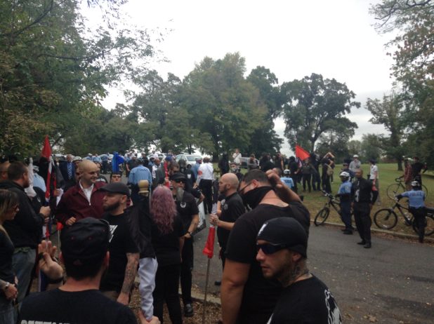 We walked over to a pavilion to join up with other members of Keystone United waiting there. The group of antifa following us also joined up with their friends.