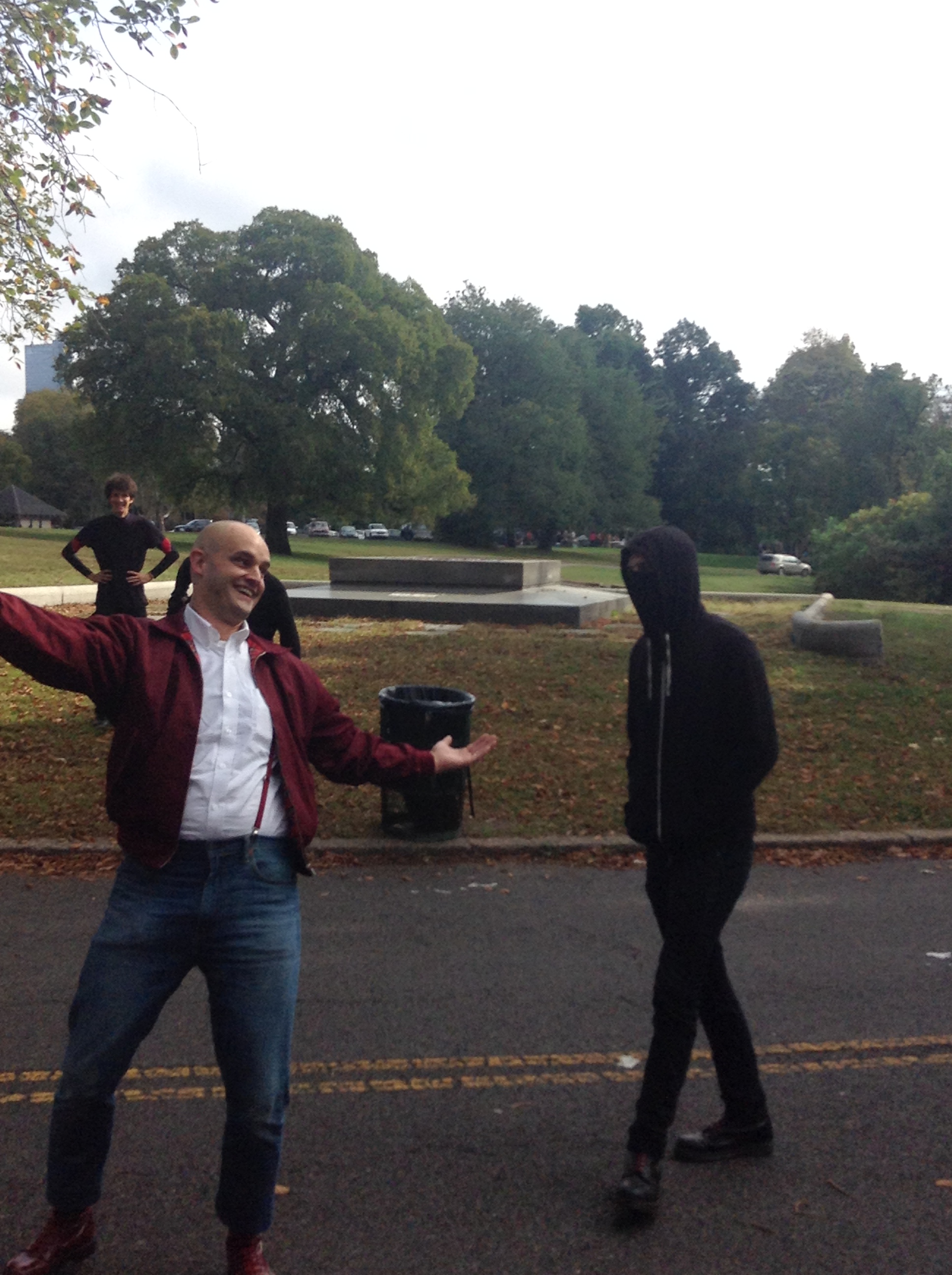 Due to an unfortunate OPSEC mistake, the real date ended up getting leaked, and when I got to Fairmount Park to meet my friend Shiro Nakatomi (not a real slope) we spotted morbidly obese Antifa activist and porn addict Daryle Lamont Jenkins sitting by himself. Shiro, who is also doxed and well-known in the area, greeted him with “Hey, Daryle The Barrel, what’s up?!” To which he nervously replied, “Um, hi.” Didn’t even attempt to hinder us evil Nazis on our way to an event of pure hate – SAD!