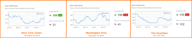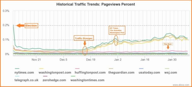 The Washington Post and The Guardian (UK) saw similar traffic trends around the same time, in stark contrast to most of their peers. A quick before-and-after illustrates the dramatic pickup in visitors: