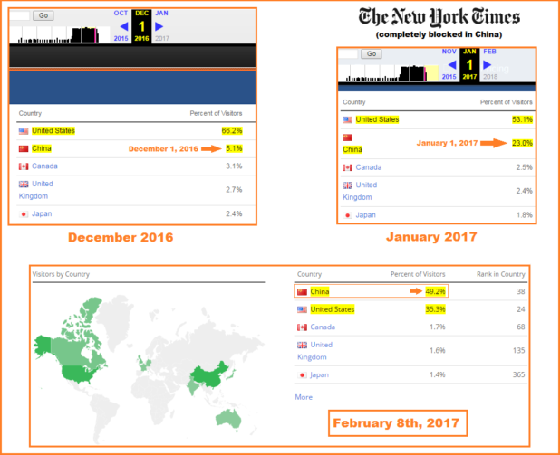 That’s odd. Now let’s take a look at each outlet’s traffic by country for the NYT, which shows significant increases in visitors from China, jumping from 5.1% to 49.2% of all site traffic in two months: