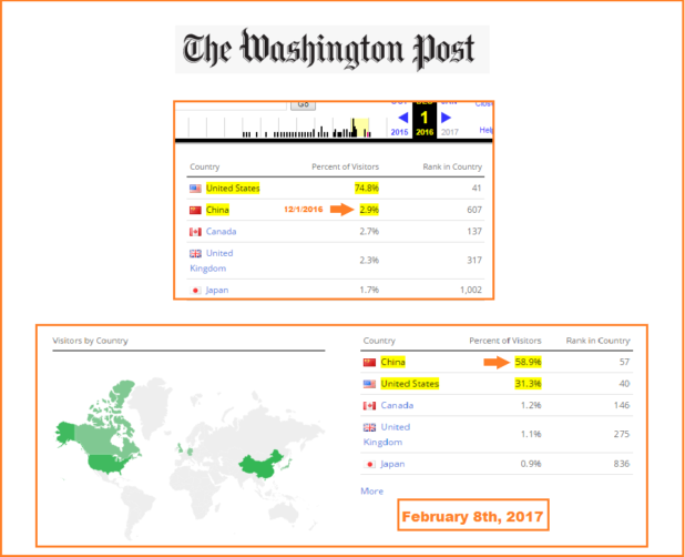 Not to overstate the obvious, but considering the URL ban on the New York Times, one might conclude that this massive increase which now accounts for nearly half of all website traffic is some type of high volume traffic generating bot server unimpeded by China’s restrictive firewall, synthetically inflating visitor counts for affected sites.