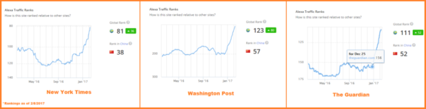 Now let’s take a look at the Washington Post and The Guardian, which are not blocked in China – jumping from virtually no traffic to 58.9% and 57% of site-wide visitors respectively.
