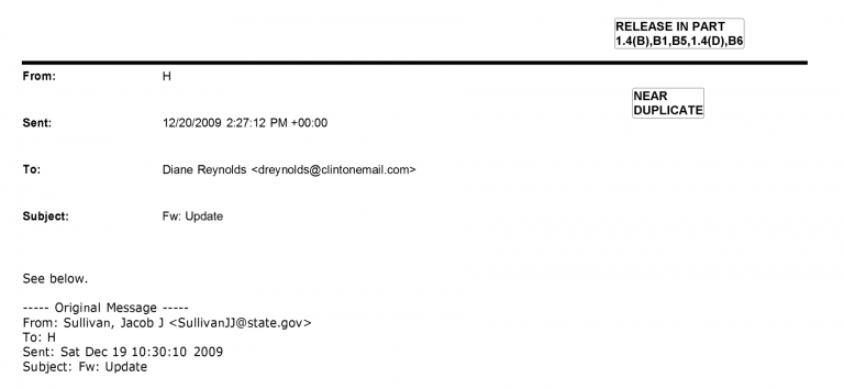 The email, which is redacted because it contains information classified as “Confidential,” was sent to Jake Sullivan, Clinton’s foreign policy adivser at the State Department, and several Obama aides. Sullivan sent it to Hillary Clinton who then forwarded it to Chelsea, who emailed under the pseudonym “Diane Reynolds.”