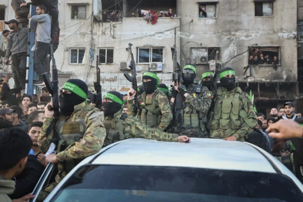 There was an element of theater in Sunday’s handover of three Israeli hostages to the Red Cross, when dozens of masked Hamas fighters wearing green headbands and military fatigues paraded in front of cameras and held back a crowd of hundreds who surrounded the vehicles.