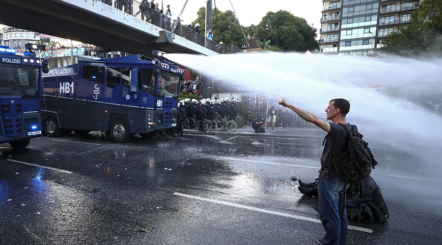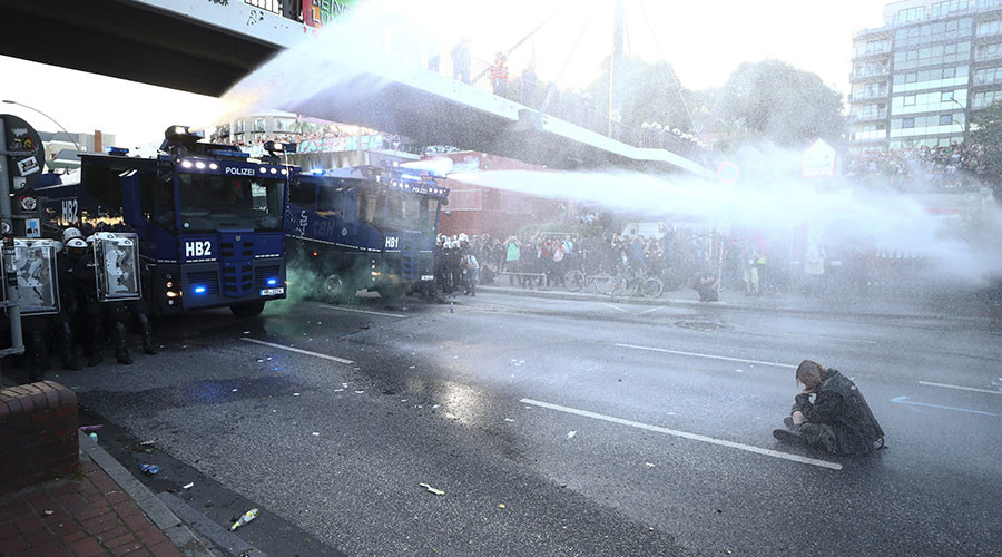 G20 protesters staged a sit-in demonstration and blocked a road in Hamburg on Friday morning. Police said that they tried to urge the protesters to disperse peacefully, but then deployed water cannon to clear the road.