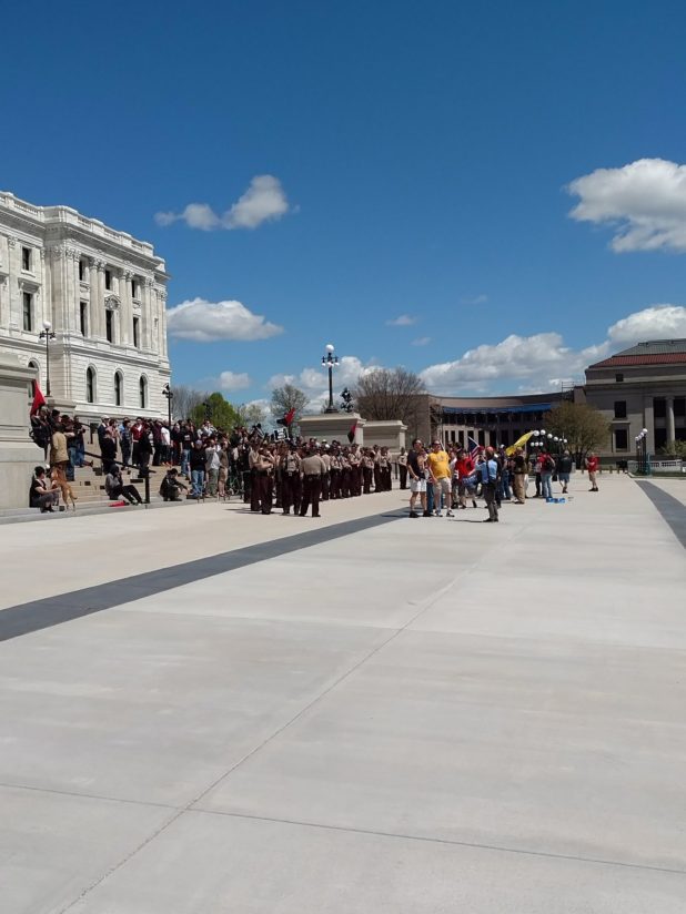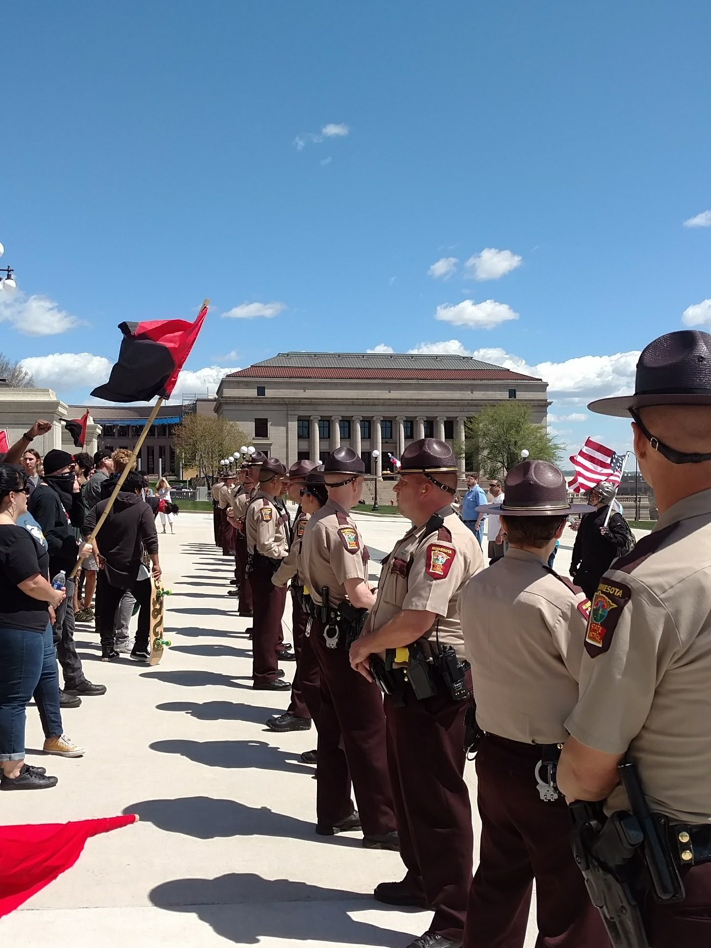 Troopers from the Minnesota State Patrol, which provides security at the Capitol, kept the groups separate, heading off physical confrontations. Loud chants, insults and profanities were exchanged well past noon, but no arrests were reported.