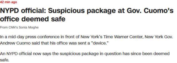 This is a photograph of the suspicious package that was sent to the CNN building in New York City earlier this morning. It was addressed to John Brennan, the former CIA director, and “Time Warner (CNN).”