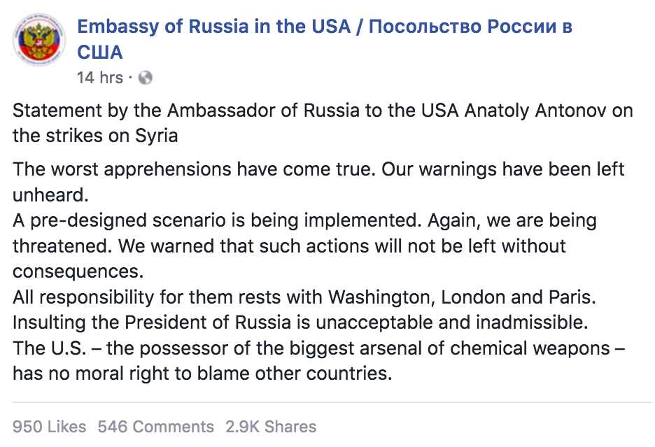 “We warned that such actions will not be left without consequences,” said Anatoly Antonov, the Russian ambassador to the U.S. “All responsibility for them rests with Washington, London and Paris.”