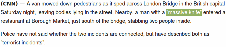An eyewitness has said that one of the attackers with a “massive knife” proclaimed that he was doing it for Allah. Also isn’t a “massive knife” just code for a machete?