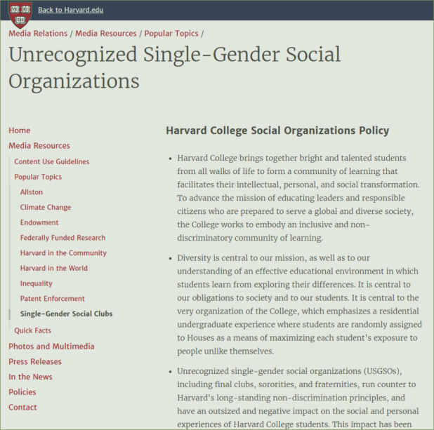 The fact is that Harvard has been pressuring all these groups into allowing women (and vice-versa) since the 80’s. In response, they dropped all official association with the school. So now, the college is trying to destroy them from the outside.