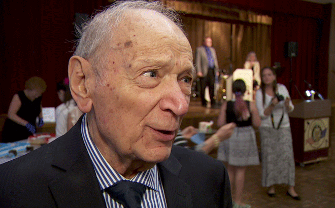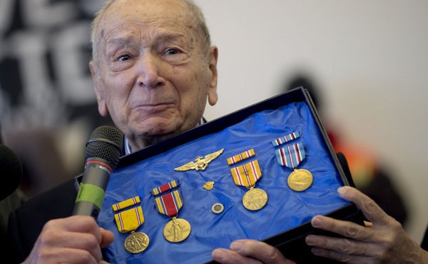 U.S. Navy veteran Dario Raschio was all smiles Saturday as he awaited a special honor from U.S. Sen. Ron Wyden, who joined him at Portland Community College’s Southeast Campus to present the 100-year-old with a handful of medals.