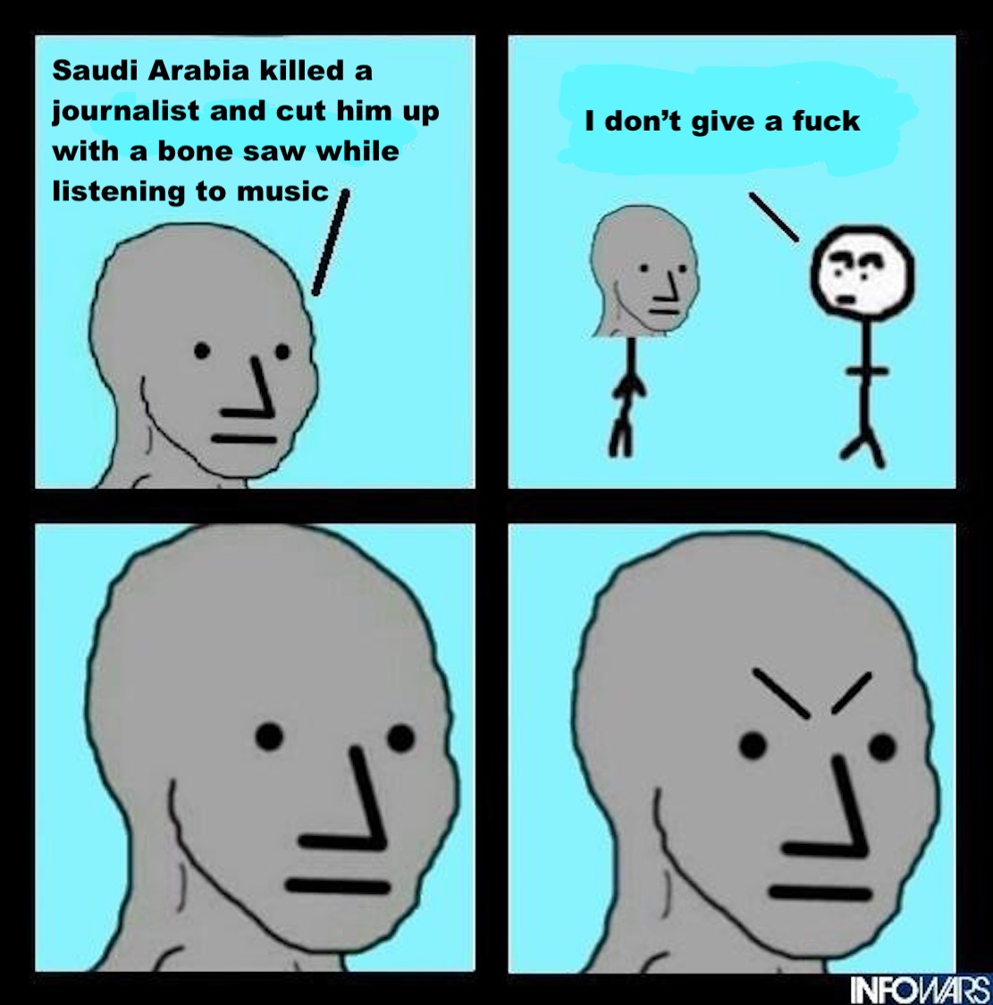 But that media smokescreen is gone. They weren’t being clever, they were just getting their asses covered for them. Now, NPCs are getting a new script download. This one’s pretty simple. Saudi Arabia = Bad.